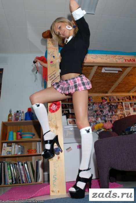 Телка обожает выглядеть хорошо, и в отличие от своих одноклассниц следит за фигурой, но порой одевается слишком вызывающе. Придя домой она наводит порядок, вешает на стены фотки, а под короткой юбкой студентки офигенные бедра видно. И даже иногда мелькают ягодицы. Это ее брат снимал, как девушка чем-то занималась по хозяйству, наклонялась, манила сексуальной задницей... ох как хороша развратница с юного возраста! И обратите внимание на белые эротичные носки с значком плейбоя.
