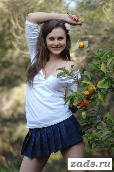 Эта девушка привораживает своей внешностью. Ее реально хочется обнять и поцеловать. Голая девочка пришла собирать мандарины в сад экзотических фруктов. На ней одета коротенькая расклешенная юбка и с глубоким вырезом белая блузка. Под юбкой красивые трусики.