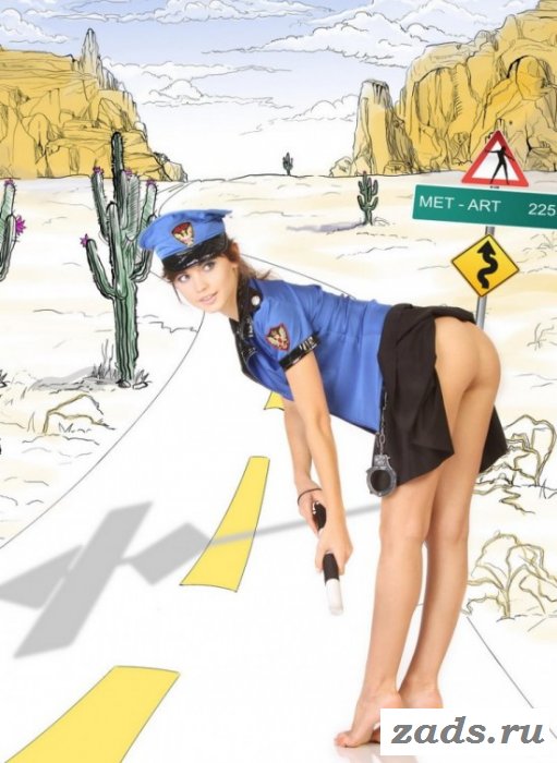 Преуспевающая работница органов правопорядка справляется со своими обязанностями очень легко, достаточно телочке на проселочной дороге снять трусики и лифчика - как машины сами останавливаются, даже указкой махать не приходится. Раздетая гаишница машет дубинкой, за ее спиной дорога, но любой водила сразу смотрит на сладенькие дольки половых губ и уже сам готов отдавать девочке деньги... быть может она предоставит и еще какие-то услуги. Фигура у красотки в униформе ништяк, сиськи мелкие, но ротик очень милый.